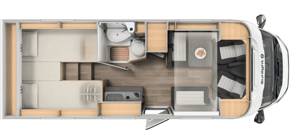 - 3-4 Schlafplätze (2 Einzelbetten, 1 Bett über dem Tisch ausziehbar)